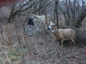 I almost always incorporate a decoy when ground blinding. This decoy serves as another distraction from the blind itself and pulls the attention off of you. I also use the decoy as a marker for distance. I like to put the decoy at l5 yards and then place branches or pieces of wood beyond that decoy so I can rangefind those distances from the inside of the blind. Once you are setup you will know the exact distances from inside your tent and won’t be guessing when the “moment of truth” arrives. Now that I think of it, I have never arrowed a deer from a groundblind WITHOUT a decoy.